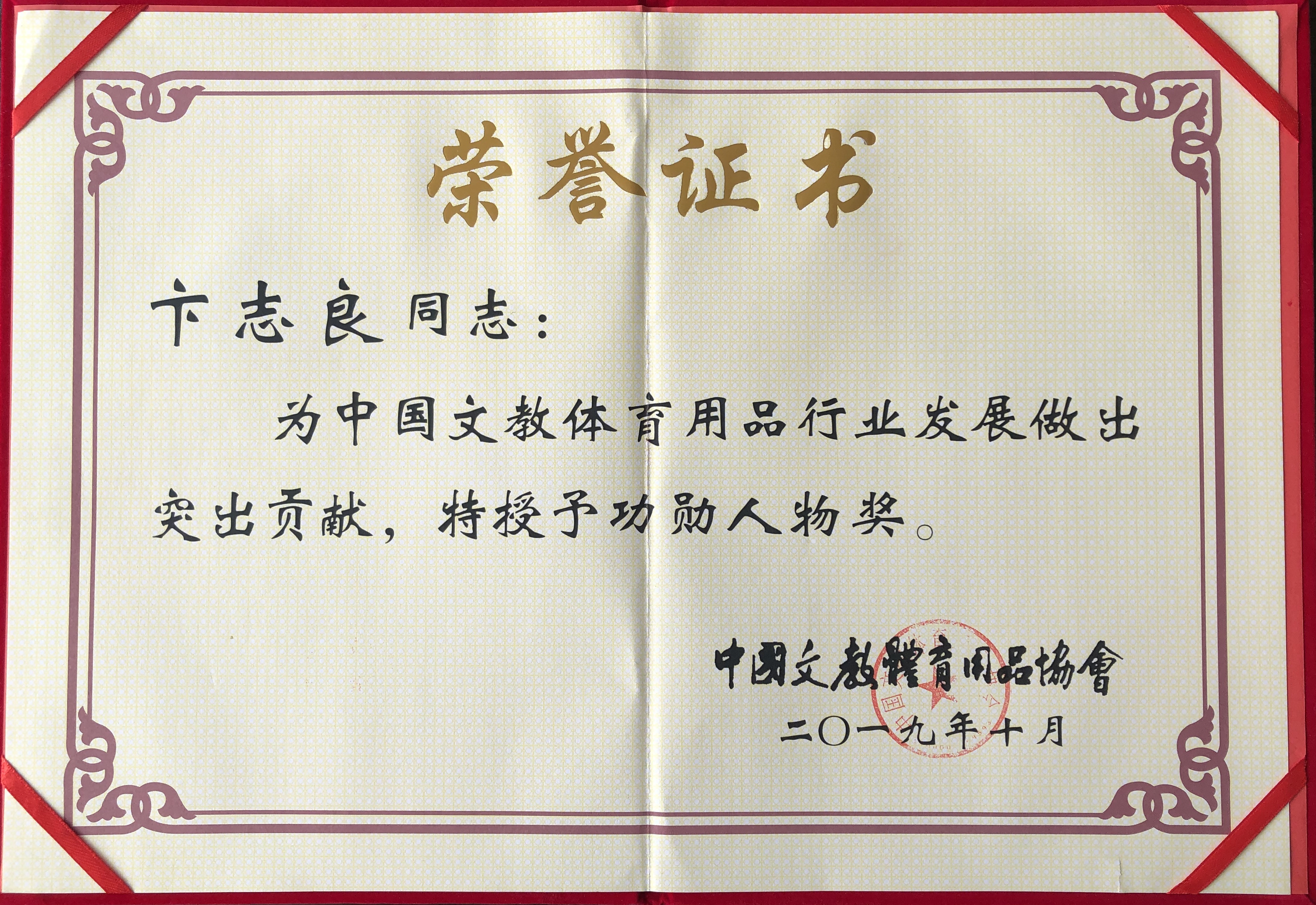 10月18日,中国文教体育用品协会第八届三次理事会暨成立三十周年庆典大会在北京人民大会堂隆重召开。1989—2019三十年间,我国文教体育用品行业发生了翻天覆地的变化,取得了辉煌的成绩。为弘扬艰苦创业、改革创新精神,鼓舞全行业奋勇前行的斗志,暨协会成立三十周年之际,文体协会隆重表彰一批为行业发展做出突出贡献的模范人物,酷游-KU游体育产业集团董事长卞志良荣获“功勋人物奖”。