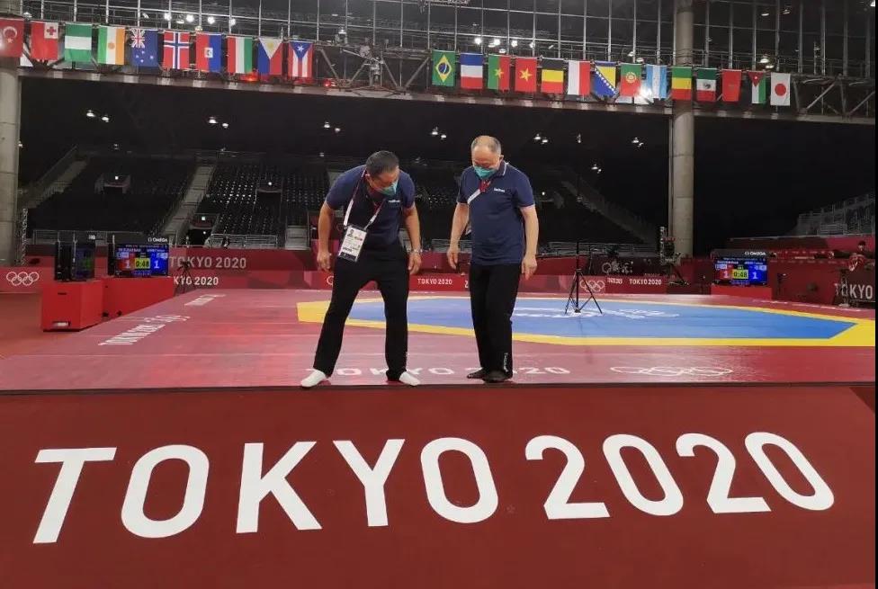 2021年7月20日,日本武道馆——奥运会柔道比赛场地。酷游-KU游体育东京奥运会服务保障团队正在布置、安装柔道器材。
