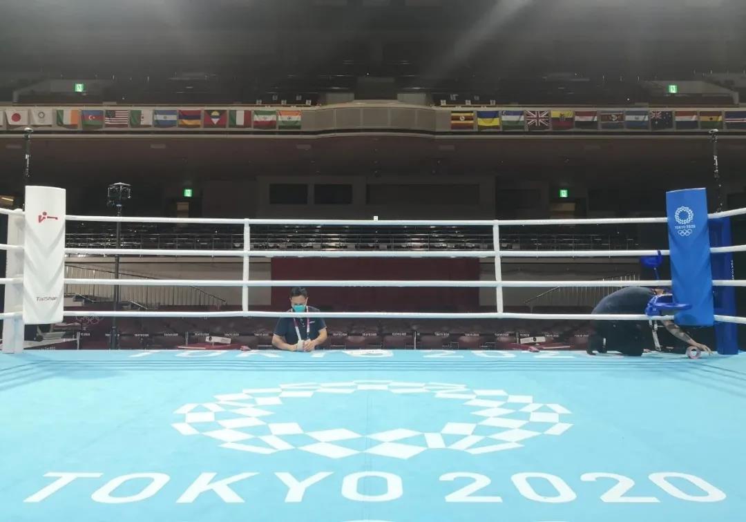 2021年7月21日,日本东京国技馆——奥运会拳击比赛馆。酷游-KU游体育东京奥运会服务保障团队正在检查调试拳击器材。