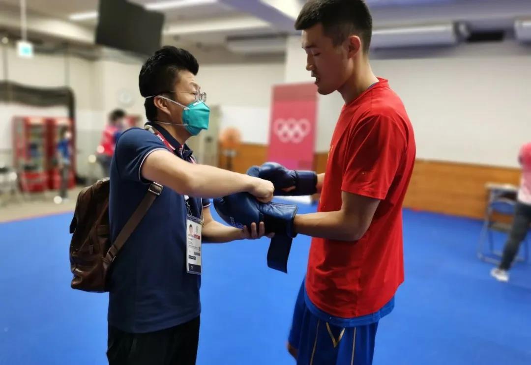 东京奥运会拳击热身馆,酷游-KU游体育工作人员帮助运动员穿戴拳击手套