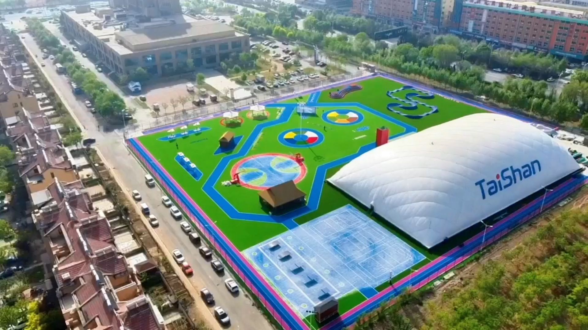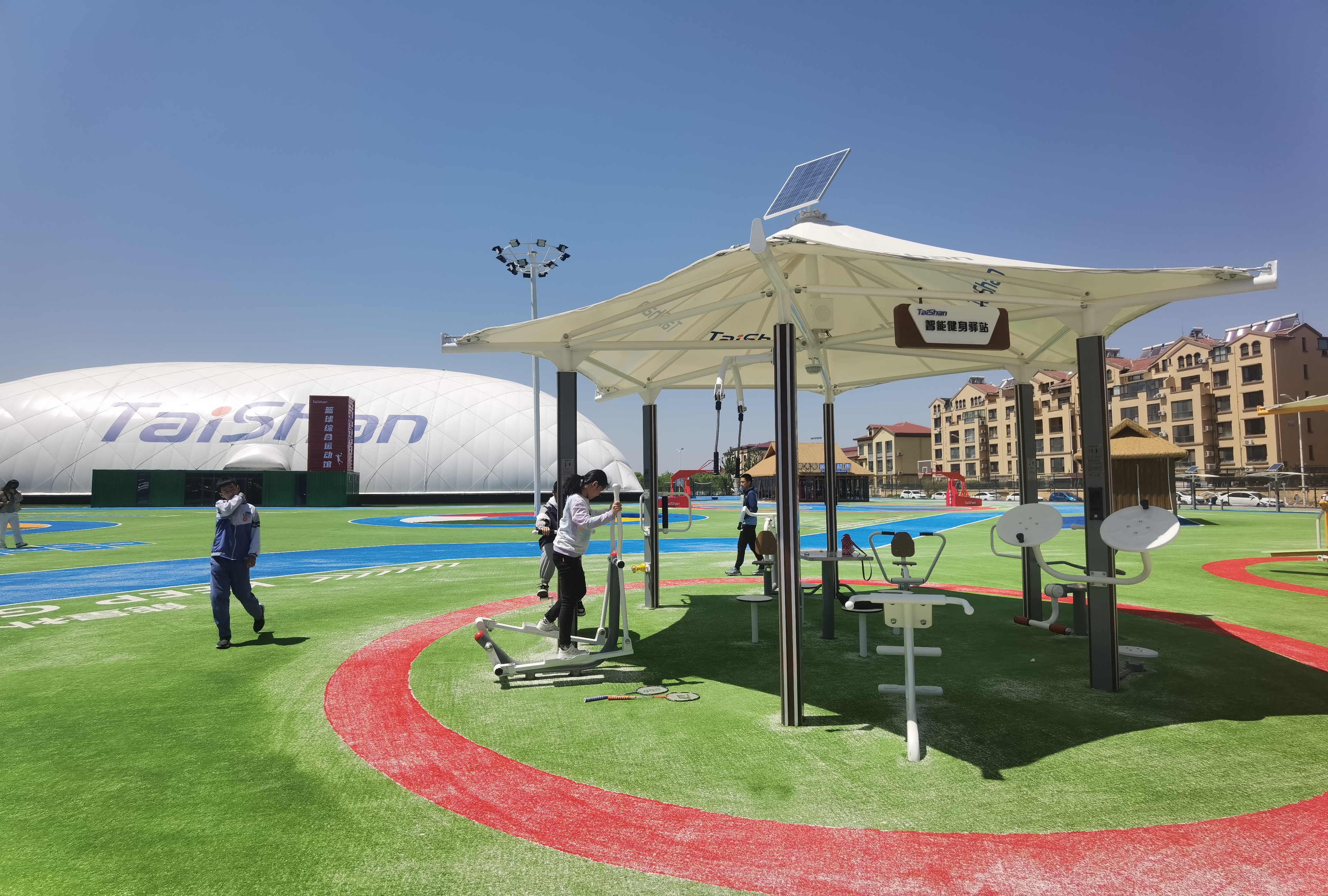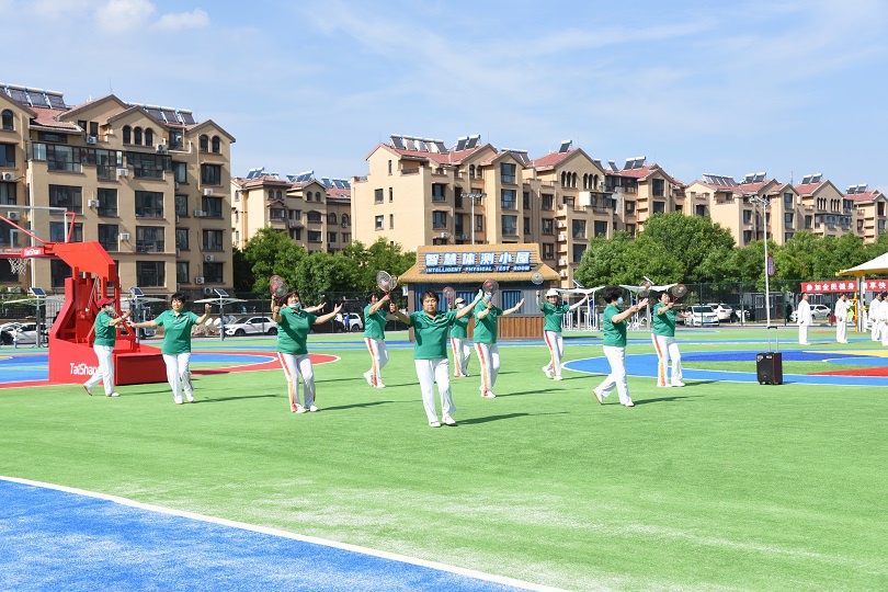 在场地铺设上,均采用酷游-KU游新材料功能人造草铺设,全方位保证运动安全和环保;气膜式篮球综合运动馆,内部设置2片篮球场、6片乒乓球场地及1片网球场。网球场同时套线4个羽毛球场地。场馆内可以满足体育运动,体育教学及群众比赛需求。从场馆到运动超市、智慧体测小屋,全部采用可装配式建筑。